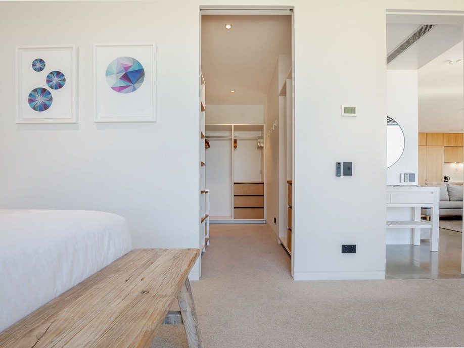 The central living hub features polished concrete floors, high ceilings and floor-to-ceiling glass which create an attractive atmosphere for everyday living. The well-equipped kitchen with breakfast bar delivers culinary precision and includes a stone benchtop, integrated German appliances and comprehensive storage.