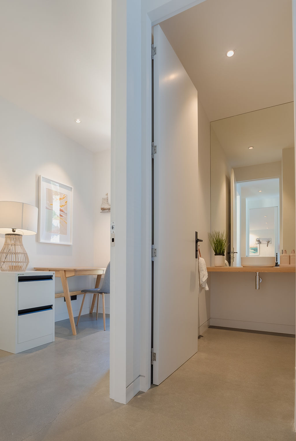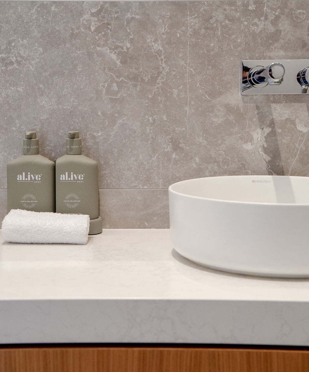 The central living hub features polished concrete floors, high ceilings and floor-to-ceiling glass which create an attractive atmosphere for everyday living. The well-equipped kitchen with breakfast bar delivers culinary precision and includes a stone benchtop, integrated German appliances and comprehensive storage.